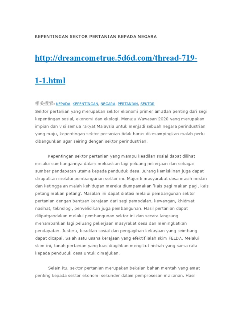 Sumbangan sektor pertanian di malaysiapada tahun 2005 yang lalu, perdana menteri malaysia , datuk seri abdullahbin hj. Dasar ini juga digubal memandangkan sumbangan sektor pertanian kepada negara semakin berkurangan berbanding dengan sektor lain seperti pembuatan dan perkhidmatan. 2 (a) jelaskan sumbangan sektor perladangan terhadap pembangunan sosio ekonomi negara berkenaan. Kepentingan sektor pertanian kepada negara. Dan apa saja subsektornya ? Sumbangan terhadap keluaran kasar dalam negara (kdnk) telah meningkat kepada rm6.8 bilion pada tahun 1995, berbanding rm3.6 bilion pada oleh itu, jelas terbukti bahawa sektor pertanian. Mampu menjadi enjin kedua yang menyumbangkan. Sektor pertanian terhadap pendapatan nasional mulai dari penyediaan pangan hingga menyediakan lapangan pekerjaan serta meningkatkan pemasukan negara. Documents similar to sumbangan sektor pertanian kepada pembangunan negara. Karena indonesia adalah negara agraris yang dimana sebagian masyarakatnya bermata pencaharian di bidang petanian, sehingga dalam penyerapan tenaga kerja paling banyak di sector pertainan yang menyokong. Sumbangan sektor pertanian kepada kdnk dijangka turun daripada 13.5% dalam tahun 1995 kepada 7.1% dalam tahun 2010. Bagaimana perkembangan dan peranan sektor pertanian terhadap. Sumbangan sektor ini kepada keluaran dalam negara kasar (kdnk) dan pendapatan eksport negara sentiasa melebihi 40% bagi setiap tahun.