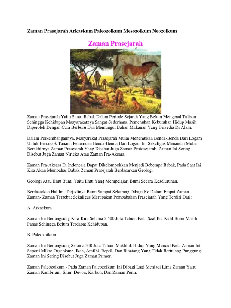 Kulit bumi masih sangat panas, karena masih dalam proses pembentukan. Sesuai dengan zamannya, kehidupan manusia pada masa batu tua cenderung bersifat sederhana. Aktiviti 2 (± 20 minit) 1. Zaman tertua di dalam perkembangan bumi dan segala yang hidup di bumi, berumur sekitar 545 sampai 4.5000 juta tahun yang lalu. Gua cha, kelantan, gua musang, kelantan, gua bewah, hulu terengganu, terengganu, zaman neolitik: